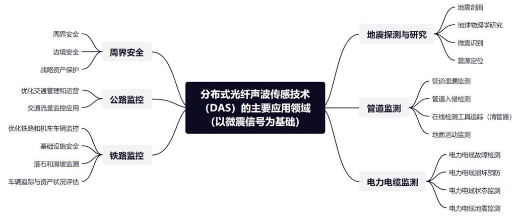 基于光纖的分布式聲波傳感器(DAS)是一種利用光纖中的后向瑞利散射(RBS)來(lái)定位和恢復(fù)光纖鏈路上的任意位置處機(jī)械振動(dòng)信息(振幅、相位和頻率)的技術(shù) 。由于機(jī)械振動(dòng)通常能夠在介質(zhì)中傳播很遠(yuǎn),DAS 能夠檢測(cè)遠(yuǎn)離光纖的事件;基于光纖的低損耗特性,傳感光纖的長(zhǎng)度可達(dá)數(shù)千米至上百千米,因此 DAS 系統(tǒng)的探測(cè)覆蓋范圍非常廣;DAS 的振動(dòng)檢測(cè)帶寬可高達(dá)數(shù)十千赫茲,可以包含待測(cè)事件的豐富信息 ;傳感光纜具有本征安全、抗電磁干擾、耐惡劣環(huán)境等優(yōu)勢(shì)。這些優(yōu)點(diǎn)使得 DAS 在周界圍欄安防、管道安全監(jiān)測(cè)、井下資源勘探等長(zhǎng)距離應(yīng)用領(lǐng)域中有著巨大的應(yīng)用潛力,并且其應(yīng)用領(lǐng)域仍在不斷拓展中。